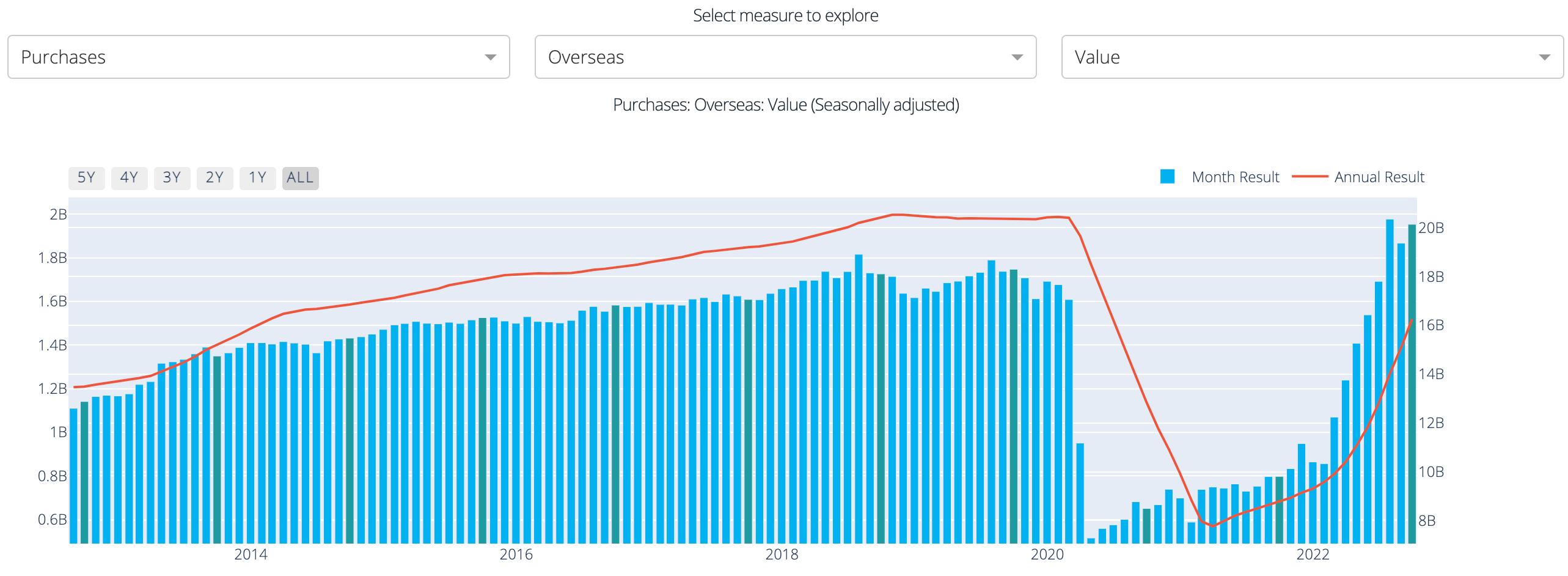 Check out the interactive dashboard here and select Overseas from the dropdown. You can also see Personal & Commercial card purchases overseas, as well as Number, Average and Account averages. https://payments.qiinsights.com/apps/explore-creditcard.