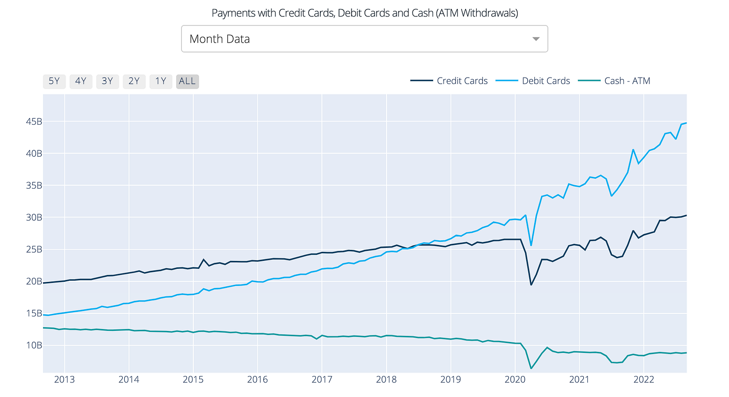 Once again we see record months in both Debit and Credit card purchases, with Credit Cards growing at 15% annually and Debit Cards up 18% annually.